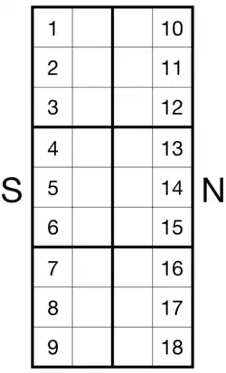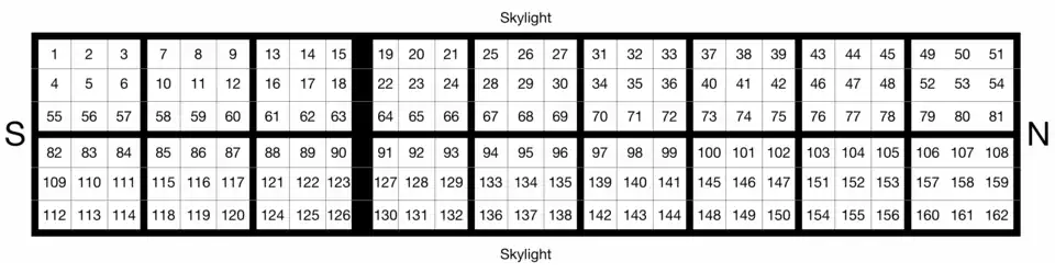 The panels are arranged in blocks of nine. The two central, uppermost rows (55–108) constitute the archaic panels. Of the outer two rows, in the six blocks at the southern end of the hall above the landing and the main entrance (1–18 and 109–126) each panel depicts a different plant considered of particular significance to the British Empire,[83] while the twelve six-panel blocks above the main hall (19–54 and 127–162) each depict a single plant considered of particular importance to visitors or to the history of the museum, spreading across six panels.[73]