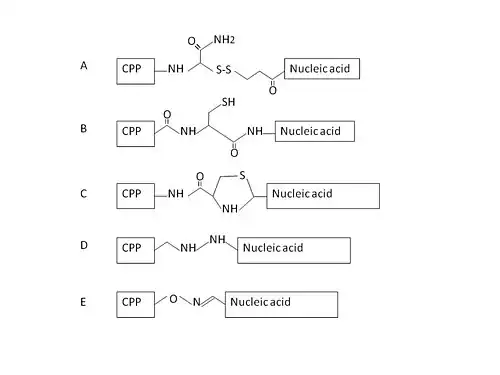 Most CPP-nucleic acid complexes that have been proposed so far are formed through covalent bonding. A range of CPP-nucleic acid complexes have been synthesized through different chemistries that are either stable or cleavable linkages. And the most widely used method in publication is cleavable disulfide linkages through total stepwise solid-phase synthesis or solution-phase or solid-phase fragment coupling.[33] Some other strategies like stable amide, thiazolidine, oxime and hydrazine linkage have also been developed.[34] However, those covalent linking methods are limited by the concern that the synthetic covalent bond between CPP and nucleic acid may alter the biological activity of the latter.[35] Thus, a new non-covalent strategy requiring no chemical modification with short amphipathic CPPs, like MPG and Pep-1 as carriers has been successfully applied for delivery of cargoes.[36][37] These non-covalent conjugates are formed through either electrostatic or hydrophobic interactions. With this method, cargoes such as nucleic acids and proteins could be efficiently delivered while maintaining full biological activity.
