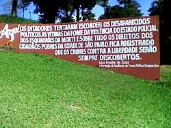 During the 1964–1985 military dictatorship, the cemetery was used for the clandestine burial of members of armed organizations fighting against the dictatorship and killed on the premises of repressive agencies, such as the DOI-CODI.[4][5] Many of the people killed by the death squads of the newly organized Military Police were also buried clandestinely in the Perus Cemetery.[4][6]