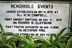 The church was established on 14 November 1875 by American Baptist Foreign Mission Society led by The Rev. W. W. Campbell, ABM, a Baptist missionary. The first member of the congregation was Richard B. Clayburn, who was baptized on 5 December 1875. The first native Pastor Bezwada Paul, STBC was appointed in 1895. The foundation stone for the existing new church structure was laid by The Rev. Louis F. Knoll, ABM on 14 November 1975 during the ministry of The Rev. K. Devadanam, STBC, exactly 100 years after the first structure was built. The church was appropriately named STBC-Centenary Baptist Church. The groundbreaking however took place five years later, in 1980. The new sanctuary was completed and consecrated by the Old Testament scholar The Rev. G. Solomon, STBC on 17 February 1991. It took more than ten years to build the existing structure.[3]