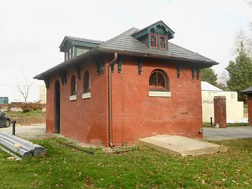 The two buildings are perhaps the only extant restrooms from a nineteenth century international exposition. They were constructed of brick with wooden elements, slate roofs and copper detailing. Each is about 20 feet (6.1 m) by 22 feet (6.7 m) and one story tall.[1] Seven public comfort stations were built for the exposition, among over 200 other buildings. Only four Centennial buildings survive on their original sites: Memorial Hall, the Ohio State Building, and the two comfort stations.[3][4]
