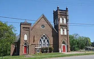 Center Street A.M.E. Zion Church is a historic African Methodist Episcopal Zion church located on S. Center Street in Statesville, Iredell County, North Carolina. It was built in 1903, and is a one-story, three bay by seven bay, Late Gothic Revival-style brick building. It has a steep gable roof sheathed in pressed tin and features two corner entrance towers of unequal height and a large, pointed arch stained glass window. The church also goes by the name Mount Pleasant AME Zion Church.[2][3]