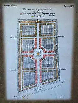 City architect Władysław Beksiński designed the communal cemetery and a Gothic Revival funeral chapel.[9][13][14][37] His design, published in 1896 in Czasopismo Techniczne,[38] served as a model for cemetery planning in Galicia.[9] The cemetery, covering 1.54 hectares at Rymanowska Street,[38] was rectangular and divided into four quarters: I (southwest), II (southeast), III (northwest), and IV (northeast).[9][39] Four main pathways converged at the center, where a Gothic Revival chapel was built for Józefa Habermann (died 2 May 1895) and her family,[40] approved by city authorities for a 250 PLN perpetual endowment.[37][41][42] Beksiński's plan allocated 2,842 burial plots:[37] 4 for distinguished individuals, 172 permanent masonry graves, 436 permanent standard graves, and 2,230 temporary graves (including 415 for the poor).[9][10] Plots along the main pathways were reserved for prominent citizens,[40] with four central plots around the chapel, while the periphery was designated for the poor.[43]