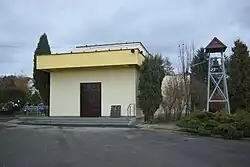 Along the main avenue leading from Rymanowska Street to the original cemetery chapel are two mass graves. The first is the Mausoleum of World War II Victims, established in autumn 1948.[96][130] This tomb contains the ashes of victims from Sanok and Sanok Land, including those who fought on World War II fronts, resistance members, prisoners of Nazi concentration camps, and others murdered. The monument was initiated by the Sanok branch of the Polish Association of Former Political Prisoners of Nazi Prisons and Concentration Camps, with planning beginning in 1946.[131] Designed by Stanisław Ryniak, an architect and former Auschwitz concentration camp prisoner (the first Polish inmate, number 31),[96][132] the mausoleum resembles a camp crematorium with a front opening and an obelisk resembling a chimney.[92][132] The main plaque reads: They sacrificed blood, suffering, and life for the Homeland in World War II. Honor their memory".[92][96][106][131] Inside, a bronze urn, crafted by association members employed at the Sanok Wagon Factory, holds soil from the Death Wall at Auschwitz concentration camp and other execution sites, including Gross-Rosen, Majdanek, Gruszka Mountain, Hanusiska Forest, Falejówka, Glinice Hill, Olchowce, and others, symbolically commemorating victims' remains.[132][133]