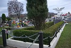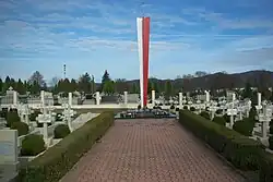 The quarter contains 154 individual graves,[103] two mass graves (one in the northwest corner with 10 victims),[104] and one symbolic mass grave with a monument. The monument features a vertical flag of Poland with an eagle at the top.[92] It bears a Virtuti Militari cross and a plaque inscribed: "In homage to the fallen. Sanok community".[92][96][105] Designed by Edmund Królicki and overseen by Tadeusz Wilk,[105] the monument was completed before 1 November 1959.[106] The quarter was surrounded by a hedge for many years. Between 1980 and 1983, renovations included installing uniform concrete crosses with white marble identification plaques on each grave.[92][96]