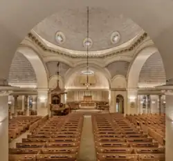 The dome and vaulting of the current structure is of tiles by Rafael Guastavino, it is the first dome that he constructed in the U.S.[13] The dome and vaulting originally featured exposed red Guastavino tile on its exterior, but this was later covered with copper. The original towers were damaged in storms, and were replaced in 1958.[14]