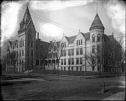 The school went through several phases. Central High was first established in 1860 when students of high-school age were added to Union Elementary. In 1864, the building was destroyed by fire and was rebuilt on the same site as Washington School, with grades K-12. A new building was erected in 1877, with the name changed to Central, on the corner of 4th Avenue South and 11th Street in downtown Minneapolis. Designed in Victorian Gothic style by Franklin Long and Charles Haglin, the building was described by Minneapolis architecture critic Larry Millett as "one of the most impressive buildings of its time in Minneapolis."[2] It was expanded in 1886.