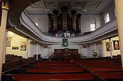 The chapel can seat 1,500 worshippers in a horseshoe formation, some on oval gallery above. On the ground floor, there are original numbered box pews. The three-manual organ with 2,500 pipes was installed by John Brown in 1841 and rebuilt in 1931. Notable monuments include a sarcophagus dedicated to Joseph Agar, and a tabernacle dedicated to the Reverend David Hill, a local missionary to China.[1][3][4]