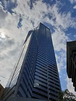The profile of the building has multiple setbacks, to provide for variable floor areas to cater to the needs of different tenants.[25] The plan of the tower is based upon a square, with triangular wings extending from opposite sides. The building was oriented to make best use of the relatively narrow frontage onto St Georges Terrace.[26] The tower is clad with aluminium and glass curtain walls.[22] The building has 5,000 sheets of glass, which get cleaned twice per year.[27] Because of high winds, it can take up to 3 months to complete one window-washing circuit of the building.[27] To clean the exterior faces of the building, the window cleaners have to move vertically over 10 kilometres (6.2 mi).[12]