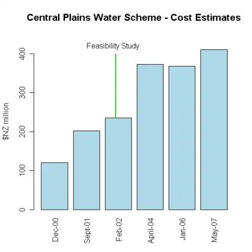In December 2000, the initial scoping study estimated the total cost of the scheme to be $NZ120 million or $1,190.48 per hectare irrigated.[33]