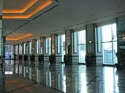 The first major tenant to sign a lease was the Provisional Airport Authority, which on 2 August 1991 agreed to lease the 24th to 26th floors.[9] A topping-out ceremony, presided over by Sir David Ford, was held on 9 April 1992.[10][11]