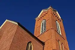 The congregation began as part of the Methodist Episcopal Church, a forerunner of both the Methodist Church of Canada (1884) and the United Church of Canada (1925). The first church building, a log structure, was erected in 1821, followed by a larger brick church constructed in 1849. The present building, dedicated in 1887, and built in the Gothic Revival style, has been altered and updated on several occasions, but retains the landmark tower. The tower includes examples of abat-sons. The church was one of the final projects of William Henry Mallory Sr., architect.[2]