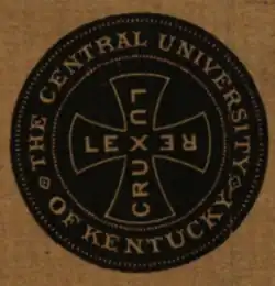 Beset with financial difficulties and small enrollment, the university consolidated with Centre College in Danville, Kentucky on July 16, 1901.[2][1] The merged institution was called Central University of Kentucky and was located in Danville on the Centre Colleges' campus.[1]
