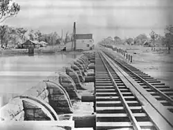 The first section opened to Westwood, the place where the roads to Taroom, Springsure, Peak Downs and the central west diverged, 46 kilometres (29 mi) from Rockhampton, in September 1867. Freight being carried by bullock teams from further west found no advantage to transferring to rail for such a short distance, and so the government was forced to extend the line in sections from 1874, reaching Blackwater in 1877[2] and the Nogoa River in 1879, leading to the establishment of the town of Emerald.