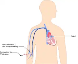 A peripherally inserted central catheter, or PICC line (pronounced "pick"), is a central venous catheter inserted into a vein in the arm (via the basilic or cephalic veins) rather than a vein in the neck or chest. The basilic vein is usually a better target for cannulation than the cephalic vein because it is larger and runs a straighter course through the arm. The tip of the catheter is positioned in the superior vena cava.[1] PICC lines are smaller in diameter than central lines since they are inserted in smaller peripheral veins, and they are much longer than central venous catheters (50–70 cm vs. 15–30 cm). Therefore, the rate of fluid flow through PICC lines is considerably slower than other central lines, rendering them unsuitable for rapid, large volume fluid resuscitation. PICCs can easily occlude and may not be used with phenytoin.[28] PICC lines may also result in venous thrombosis and stenosis, and should therefore be used cautiously in patients with chronic kidney disease in case an arteriovenous fistula might one day need to be created for hemodialysis.[40][41]