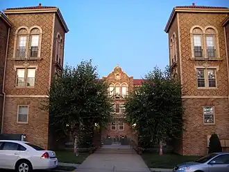 Century Apartments, also known as the T.L. Ritchey Apartments, is a historic apartment building located at St. Joseph, Missouri. It was built in 1926, and is a three-story, U-shaped, Mission Revival style buff brick and terra cotta building. It features a large central courtyard, polychromatic brickwork, and quatrefoil windows.[2]: 5
