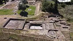 These are the ruins of Roman villa constituted by two residences (the principal along the harbour), baths, necropolis, dams and fish salting stations.[5] Of the two residences and baths, the only remnants are compartmentalized walls, including the impluvium, atrium and tablinum.[4][5] There exists friezes of marble and fragments of painted stucco that decorated the walls, as well as the remains of poly-chromatic mosaic pavements. Two rectangular tanks serve the fish salting "buildings".[4][5][6] The necropole, which includes the remains of mausoleums and burial tombs, came much later and only recently has been unearthed and investigated.[4][5]