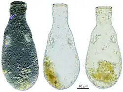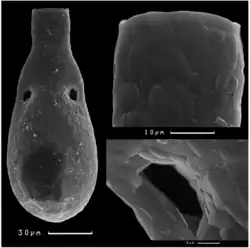 Certesella is a genus of eukaryotic unicellular arcellinid amoebae with a pyriform or flask-shaped test.[1] The base of the test, which is the posterior end, is rounded. The aperture, located at the anterior end, is oval, surrounded by a smooth chitinous lip. The inner side of the test presents several conical denticles or "teeth" that are characteristic of the genus.[6] There are two symmetrical circular holes that go through the anterior half of the test, something also particular to this genus[2] The test itself is compressed when viewed laterally, and is composed of very thin, almost transparent, polygonal[1] or circular plates.[2]