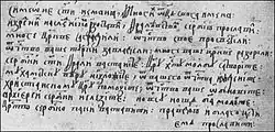 After Ottoman Empire captured Skadar in 1479 Ivan Crnojević moved his court from easily accessible Zeta Plain to the mountains where he built his court (1482) and Cetinje monastery (1484).[4] Remarkable collection of manuscripts was taken to the new court and monastery during the exodus from the churches in the plain.[5] At the end of 15th century Cetinje monastery became an important center for collecting and transcription of old charters and other books.[6] The Cetinje chronicle is a longer and supplemented version of the Studenica Chronicle (Studenički letopis), written in 2nd quarter of the 15th century.[7]