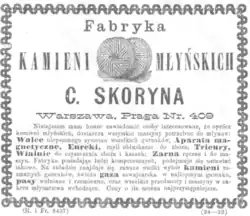 The Skoryna family's millstone factory, along with its surrounding area, was located on Brukowa Street in Warsaw's Praga district.[1] This enterprise, established in the late 18th century, was managed by Cezary Skoryna upon his return to Warsaw. Previously run by his father,[3] the business dated back to 1794, as noted in the Polish Biographical Dictionary.[1] However, Cezary Skoryna organized its centenary celebrations in 1883.[4]