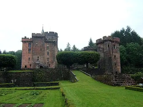 The main building is a double keep. In effect, a round keep forms one of the corners of a strong square keep. The two parts are independent. The square keep is articulated around an interior court, covered in the 19th century by a glass canopy. The fortified curtain wall includes seven towers, of which six stand today. The castle includes a kitchen garden known from records of the 16th century. It was restored in the 18th century. There is also a museum dedicated to silver mining in the canton of Pontgibaud, mostly in the second half of the 19th century by the Société des mines et fonderies de Pontgibaud.