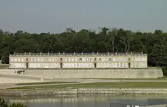 It is a long, neoclassical building, designed by Jean-François Leroy in 1769 as lodging for the guests that Louis Joseph, Prince of Condé, entertained at Chantilly.