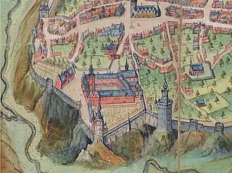 The last and most famous Croÿ prince living at the Château of Beaumont was Charles III de Croÿ (1560-1612).[2] He was born at the castle and also died here. Charles III played an important role of both sides of the Dutch Revolt. Initially, he was Stadtholder of Flanders on behalf of the insurgents. But he decided to reconcile with the King of Spain and changed sides. He fought alongside Alexander Farnese, Duke of Parma, and achieved various military victories.