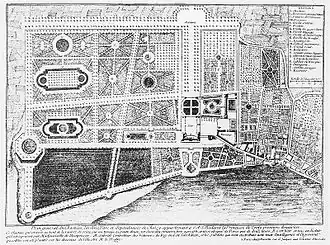- ^ "sans aucun ornement ni architecture." Mlle de Montpesier's own taste ruled: "If I had wished to read one of the books on the subject, I could have made a pretty description; but that would have been an affectation that suits me not at all." Mlle de Montpensier's authoritative taste may be detected in Le Nôtre's garden design (left), which quite uncharacteristically multiplies autonomous features without a broad unifying scheme. "I have planted many allées which are coming along very well" she remarked in 1680, but the reader scrutinizing the plan will notice that few of the allées begin or end at a place of great consequence, one sure mark of a strong-minded and enthusiastic amateur.