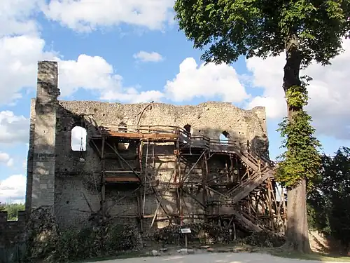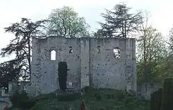 According to contemporaneous chronicler Richer, the castle built by Fulk Nerra in the 990s consisted of a tower and a surrounding enclosure. The 10th-century keep still stands, albeit in a ruinous state. It is the earliest example of Romanesque architecture in the region.[14] It is uncertain where the stone used in construction was quarried.[15] A detailed study has been done on the cost of construction of the tower. It is 16 metres (52 ft) high, 17.5m wide, and 10m long with walls averaging 1.5m thick. The walls contain 1,200 cubic metres (42,000 cu ft) of stone and have a total surface area (both inside and out) of 1,600 square metres (17,000 sq ft). The tower is estimated to have taken 83,000 average working days to complete, most of which was unskilled labour.[16] The wall enclosing the keep stretched for some 250 m (820 ft).[17] The interior rooms are richly decorated.