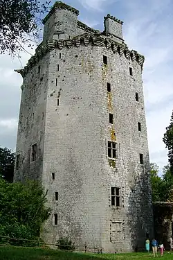 - A round tower of three storeys, from the 15th century, with cannon openings on the first level, and covered with a hexagonal building. It was furnished in the 20th century as a hunting lodge. It has been used as a location for historical films, including Lancelot du Lac and Chouans.