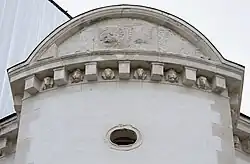 The ashlar roof base was made up of a cornice with supporting corbels, the design of which were of alternating dog heads and lion heads, reflecting a hunting theme. Photographs from 1942, show that three dogs' heads were still in place at that time. This decoration has subsequently been reconstructed on the northeast and northwest facades. With the exception of heads, the facades appear very simple, which was uncommon at the time. However, their layout is well organized and more complex than it first appears. For example, there was a gradation of materials used; rustic stone for nymphée, smooth cut stones for the roof base, plaster cornices and protruding, stepped cornices floors.