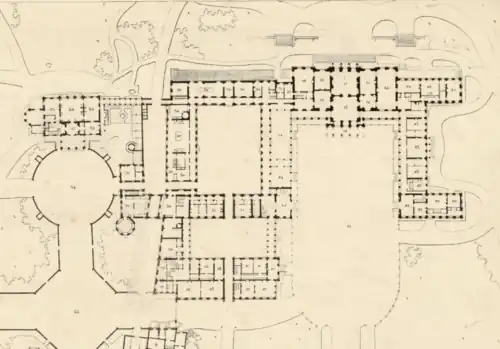 During the Revolution of 1848, the château was burned and pillaged on 25 February 1848. All that survived was the north wing built by Murat, now occupied by the Congregation of the Sœurs Saint-Thomas de Villeneuve (52, boulevard d'Argenson).[4] Confiscated by Napoleon III in 1852 with the goods of the House of Orléans, the parc was divided into 700 lots which, after the creation of seven 30 metre-wide boulevards and nine streets limited to 15 metres wide, were sold in successive auctions from 1854.[1]