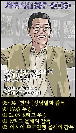 1. ^ a b 차경복 전 성남 감독 별세 (in Korean). Sportalkorea. 31 October 2006. Retrieved 18 August 2023.