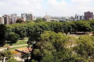 Situated over 3 mi (5 km) west of colonial Buenos Aires, land belonging to Jesuits was expropriated following their 1767 Papal suppression. The extensive plot was sold to a gunpowder maker in 1781, remaining in that use until the municipality purchased it in 1898.[1] A May 15, 1903, city ordinance provided for the demolition of what had become a gunpowder dump, and outlined a future, 20 hectare (50 acre) park at the site. The facility itself was planned by the City Parks Commissioner, the noted French Argentine urbanist Charles Thays, and was opened in 1909. Named in honor of the pivotal 1817 Battle of Chacabuco, it originally featured ornate entry gates, three football fields, as well as selected business installations, such as a dairy, bookstore and tree nursery.[2]