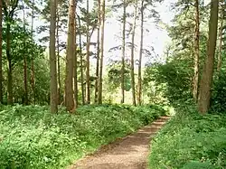 The western half has large areas of planted conifers, as well as broad-leaved trees; the conifers are gradually being replaced with native hardwoods, more suited to the local geology.[2]