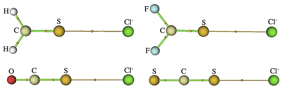 Any electron donor can donate electrons into the σ-hole of a bonded chalcogen, including halogen anions, amines, and π electrons (such as benzene). Similar to halogen bonding, chalcogen bonding can occur between two chalcogens, resulting in a chalcogen-chalcogen bond. Non-covalent interactions are well characterized by Bader's atoms in molecules (AIM) model which defines a bond as any bond-critical point (BCP) existing between two nuclei.[1] This can be understood simply as a saddle point on an electron density map of a molecule. Hydrogen and halogen bonds are both well characterized by this method. The same analysis has been performed on chalcogen bonds, as shown below. The BCP's between S and Cl in these molecules are evidence of the non-covalent interactions, in this case chalcogen-halogen bonds.[9]