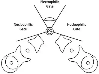 Given the dual ability of chalcogens to serve as donor and acceptor molecules for σ-hole interactions, a geometric schematic has been generated to distinguish between the differing bonding character. The σ* orbital is exactly opposite the σ bonds to a chalcogen bond. It is the region between the σ-holes in which the lone pairs localize in a donor region. These regions have been referred to as the nucleophilic gate, the σ-hole regions which are electron depleted, and the electrophilic gate, the donor region which is electron enriched.[8]