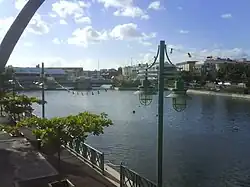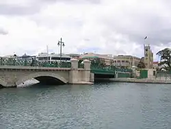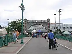 The Chamberlain Bridge is a bridge in Bridgetown, the capital and largest city of the nation of Barbados. In 1872, it was a swing bridge across the marine inlet channel of the inner basin of the Careenage (Constitution River) at Carlisle Bay.[2] The outmoded steel structure was dismantled and rebuilt in 2005–2006[3] as a lifting bridge with the state-of the-art modern technology of an all-composite single-leaf[1] bascule design.[4] This design is a counterweighted bridge span that pivots upward, permitting pleasure craft to pass through an inlet channel.[5] The bridge was built using fibre-reinforced plastic (FRP), which is lighter, long lasting and non-corrosive.[6]