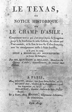 Champ d'Asile ("Field of Asylum") was a short-lived settlement founded in Texas in January 1818 by 20 French Bonapartist veterans of the Napoleonic Wars from the Vine and Olive Colony. The party was led by General Charles Lallemand. Land was offered to French settlers on March 3, 1817, after a vote by the United States Congress. Champ d'Asile was situated along the Trinity River and was abandoned in July of the same year.