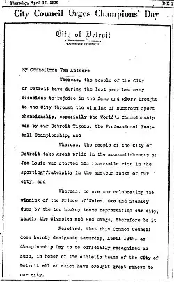 Champions Day (also known as "Day of Champions" or "City of Champions Day") is a special day that was set aside in 1936 to commemorate a number of sporting victories and accomplishments by Detroit, Michigan natives and teams in the early 1930s, and especially the 1935–36 sports season. This season was called "...the most amazing sweep of sport achievements ever credited to any single city" by the Windsor Daily Star.[1] This sports season featured, among other things, the rise of Joe Louis in the professional boxing world, the Detroit Tigers winning their first World Series,[2] the Detroit Lions winning their first NFL championship,[3] and the Detroit Red Wings winning their first NHL championship.[4]
