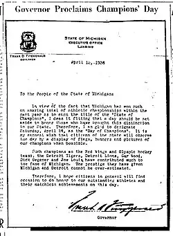 April 18 was designated Champions Day in Michigan by the state Governor Frank Fitzgerald, and then specifically for Detroit by the Detroit City Council. Governor Fitzgerald, who is referred to as an enthusiastic sport fan by the Grosse Pointe Review, urged citizens "to pay tribute to the heroes of the sport world who have brought honor and glory to the State and Detroit."[5]