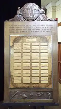 A wood plaque was also presented to the city by the White House on July 16, 8:00 pm in Traverse City during the 1936 Cherry Festival.[15][16] The plaque bears the signatures of President Franklin D. Roosevelt as well as the Governors of all the states in the union (48 at the time). Presenting the plaque was Michigan governor Fitzgerald and accepting on behalf of the city was John W. Smith, president of the Detroit Council. Also participating in the ceremony was Walter O. Briggs, Jr., (front office executive of the Tigers), Louis Giffels (Red Wings player), and Tommy Emmet (Lions' public relations director).[17][18] The plaque bears the inscription: "A nation appreciative of those qualities of character essential to success in competitive athletics salutes Detroit, which in this year of 1936 richly merits recognition as the City of Champions." The presentation was broadcast over a national radio chain.[19] The inscription was authored by Harold Titus.[20]