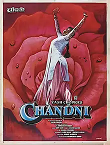 Chandni (Moonlight) is a 1989 Indian Hindi-language romantic musical drama film directed and co-produced by Yash Chopra from a story written by Kamna Chandra with a screenplay by Umesh Kalbagh, Arun Kaul, and Sagar Sarhadi. The film stars Sridevi in the title role of Chandni Mathur, a young effervescent woman torn between two suitors played by Rishi Kapoor and Vinod Khanna. Waheeda Rehman, Anupam Kher, Sushma Seth, Mita Vashisht, and Manohar Singh feature in supporting roles.[1]