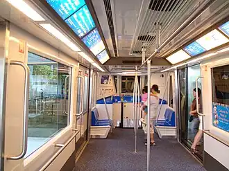 Interior of the Skytrain Crystal Mover on PMS/North; trains on PMS/South feature orange seats | |