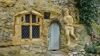 This Oratory Chapel, a place for prayer, was built possibly by a master mason, known as 'John the Mason' or 'John Mason', in 1408 or 1409.[4] The chapel was recorded in a charter of King Henry IV[3] "John Mason received from the lord a piece of waste land below the quarry with licence to excavate there beneath the quarry in order to make and hold a chapel; which he and his assigns are to have and to hold for the term of their life for an annual rent."[3] Various versions of the legend of its creation exist, one of which is that John the Mason was working in the nearby quarry when he saw that a rock fall was about to engulf and kill his son. Unable to reach him in time he prayed to the Virgin Mary and miraculously the stones changed direction and his son was saved. John pledged to create a chapel as thanks for the miracle.[2]