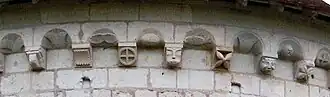 The conical roof is supported by a cornice decorated with 45 modillions and 45 metopes, some original, some restored in the 19th century, others more recent (second half of 2010). The metopes and modillions, all different in style and rather naive in sculpture, represent geometric motifs (checkerboard, etc.), ornaments in the form of objects (millstone, cross, etc.), animals (fish, etc.), plants (flower, four-leaf clover, etc.) or figures (human or animal masks, etc.).[48]