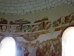 The interior of the chapel - traces of which are also to be found in the remains of the arch that marked the start of the nave[23] - was entirely decorated with polychrome Romanesque frescos painted when the building was first constructed or shortly afterwards.[56][57] Most of these frescos were already in a poor state of repair when, in 1862, the French government undertook restoration and consolidation work on the interior of the chapel, on the wall beneath the bays and on the dome, permanently erasing all traces of some of the frescos. However, in 1850, the artist Savinien Petit completed a survey of the frescos, and his work is now preserved at the Médiathèque de l'architecture et du patrimoine.[58][59] Since then, the frescos have been deteriorating;[60] the development of mold, observed during a restoration campaign in 2009, is altering certain motifs and making them difficult to interpret.[61]
