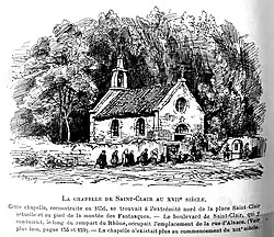 The Lyonnaise chapel was located north of the Place Saint-Clair, before the Croix-Rousse rampart, near the Bastion Saint-Clair.[13] Today, this square is called Louis Chazette.[12] On a cadastral plan dating from 1755 or 1756, the chapel's footprint measures 45 feet long by 19 feet wide.[14][note 1]