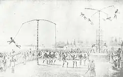 Charak Puja or Pachamara Mela (also known as Chadak, Nil Puja or Hajrha Puja)[1][2] is part of the Hindu folk festival of Gajan, held in honor of the deity Shiva or Dharmathakur.[3] The Gajan festival includes numerous forms of austerities like walking on hot coals or piercing the body with metal rods;[4] Charak refers to the practice of hook-swinging which generally is the last penance performed during the festival.