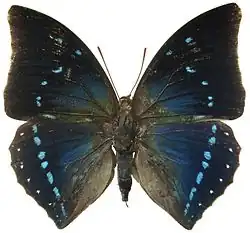 Male Wings above blue-black with the fringe orange, the basal area shot with dark blue-green. Front-wings traversed beyond the middle by a series of six small spots the third to fifth lunular, the others sub-ovate; a sub-costal of the same colour between them and the apex. Hind-wings with an oblique discal series of seven blue spots occurring from the apex to the anal angle; eight sub-marginal white spots delicately encircled by blue scales and seven linear marginal spots. Abdominal margin and body brown, coarsely clothed with hair.